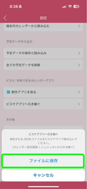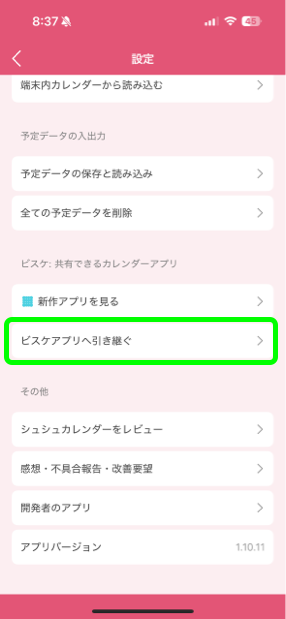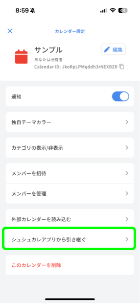 5: カレンダー設定画面から「シュシュカレアプリから引き継ぐ」を選択します。