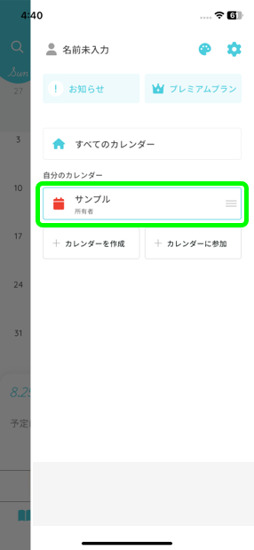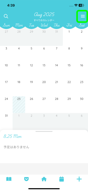 1: カレンダー画面の右上のメニューボタンからカレンダー一覧を開きます。