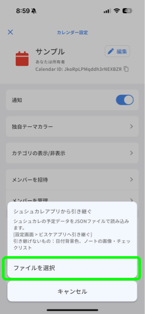 6: 「ファイルを選択」から、シュシュカレの引き継ぎデータを選択すると引き継ぎが行われます。